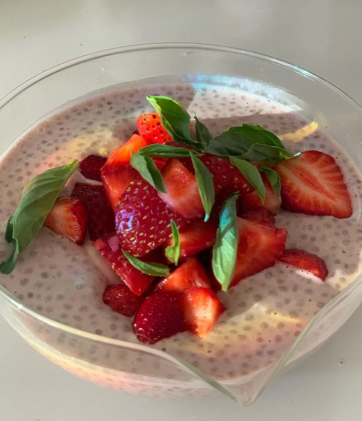 To plate, pour even amounts of chia into each bowl, Add a dollop of whipped cream into the middle and top with fresh strawberries and basil.
